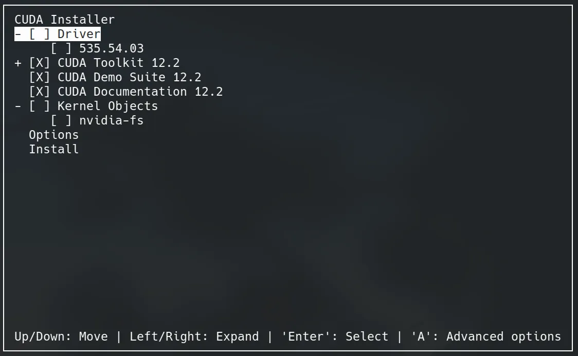 $ ./cuda_12.2.0_535.54.03_linux.run --overrideCUDA 安装程序也是用 ncurses 写的,执行后千万记得在 CUDA Installer 里面 uncheck 安装驱动的选项,然后只勾选 CUDA 相关的东西安装即可。