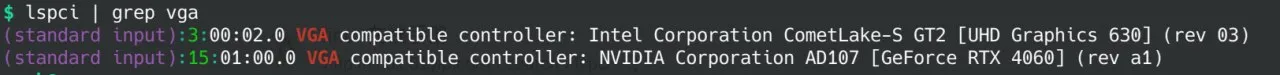 集显开机后,首先用 lspci | grep VGA 查看系统 VGA 设备,看是否正常识别到了显卡。如果发现有集显和独显两个设备,那么就是正常的,否则检查前面的步骤。