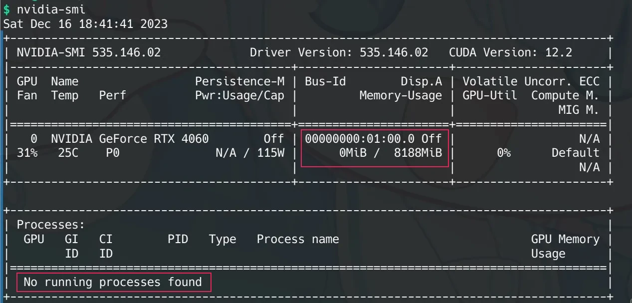 驱动安装完成后,什么也不做重启 PC,成功进入桌面,用 nvidia-smi 命令查看显卡状态,有下面的输出,说明驱动已经在正常工作了。但是,我们可以发现 "No running processes found" 而且显卡显存占用 "0MiB / 8188MiB",说明显卡根本没有在工作,难道它在偷懒吗 (?),还记得我们一开始装驱动时用的是集显 (不然无驱动状态下独显用不了啊),此时 BIOS 还没有设置使用独显,所以我们还需要进 BIOS 重新设置一下。