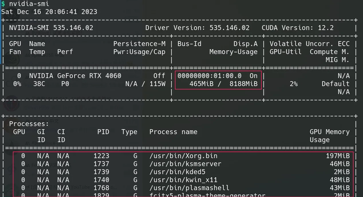 如果你没有使用独显显示和其他图形相关的需求 (比如只用来炼丹或写 CUDA),那么此时你已经拥有了一张性能可以完全释放和压榨的卡 (a freaking on-chip server?!),可以不用进 BIOS 设置独显了。但是,笔者确实有独显图形相关的需求 (指玩 Minecraft),所以还是得启用独显用于图形显示。重启进 BIOS 设置好后,再查看一下显卡状态,此时发现显存有占用了,X11 和 KDE 的各种进程也都用上了显卡。