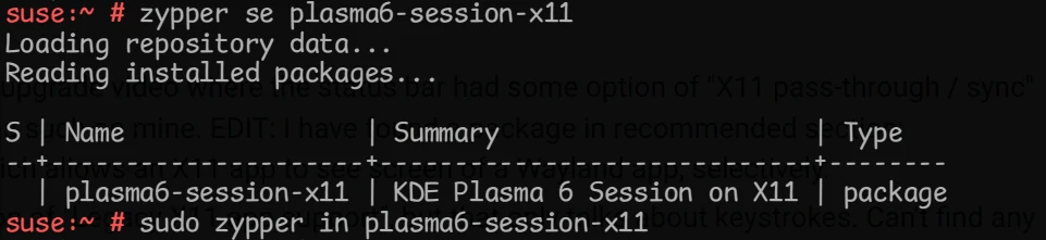 2024-04-04: 第三次滚挂,内核从 6.7.6 升级到 6.8.1,重装驱动失败,nvidia_drm 模块构建失败 (貌似是与 CUDA 相关的模块),万幸的是去官网发现驱动有更新,于是抛弃旧的 535.146.02,用 wget 下载新的 550.67 版本,安装成功。蛋疼的是这次更新 KDE5 升级到了 KDE6,默认启用 Wayland,而且 SDDM 里面只有 Wayland session,Login 进去桌面黑屏 (of course, wayland + nvidia = black screen)。尝试 Ctrl-Alt-T 打开 Konsole,可以正常显示,用 zypper 安装 KDE6 X11 session 并重启,SDDM 就有 X11 session 的选项了,成功进入桌面环境,又一次完美的操作! 另外,如果滚挂可以尝试 grub 中的 advanced options,选择用旧的内核 boot。