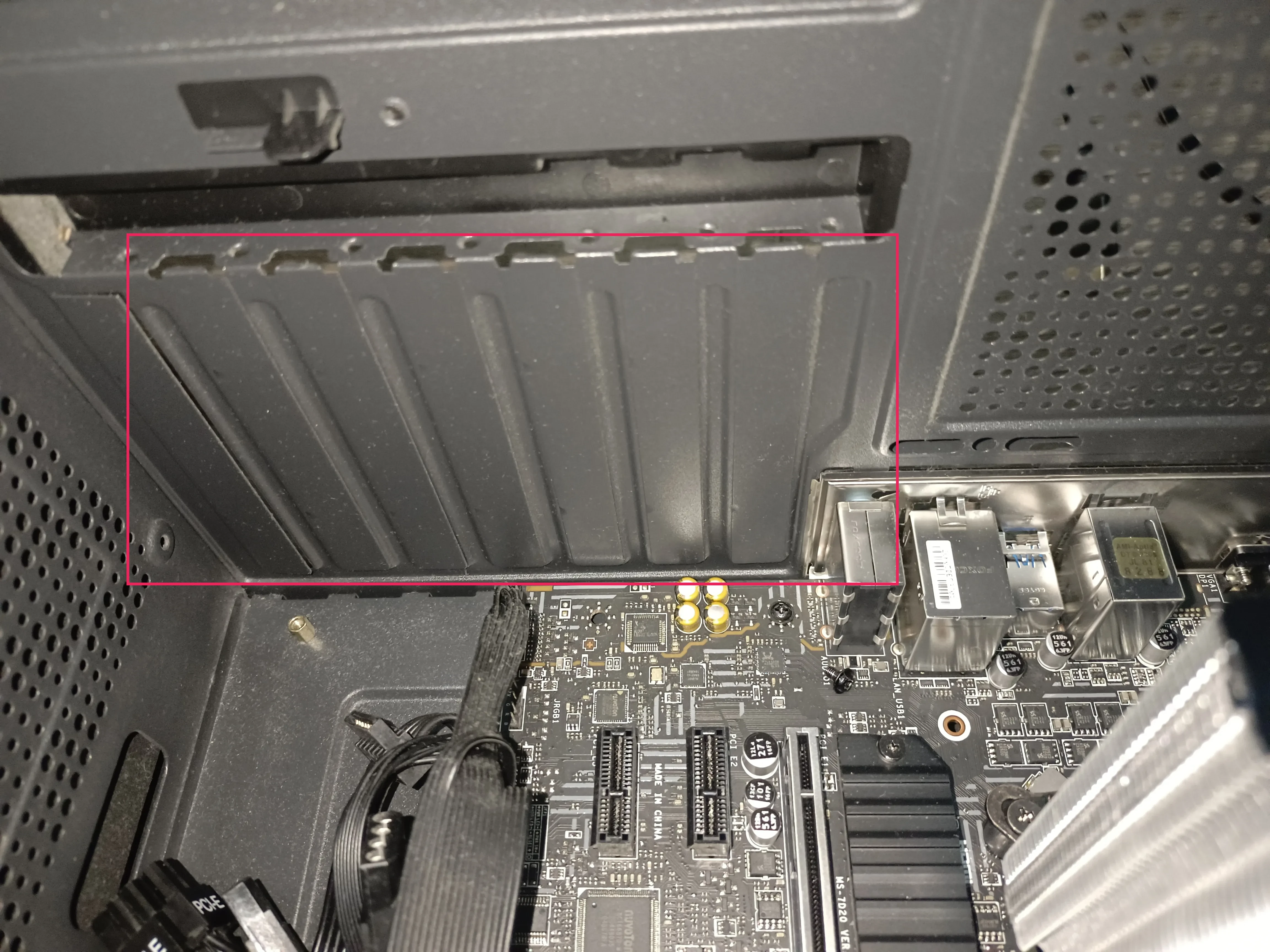 折腾了一会,突然想起来,显卡一侧有几个接口 (?),于是重新给显卡卸下来看到了 HDMI 的接口,但机箱背面会挡住这些接口,捣鼓了几下原来这些背板可以拆!拍断大腿,我还以为机箱规格有问题,和显卡不适配!